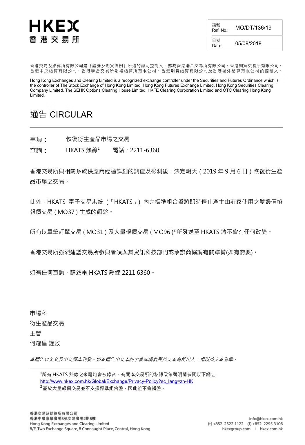 香港交易所宣布, 決定於明天9月6日恢復衍生產品市場之交易.